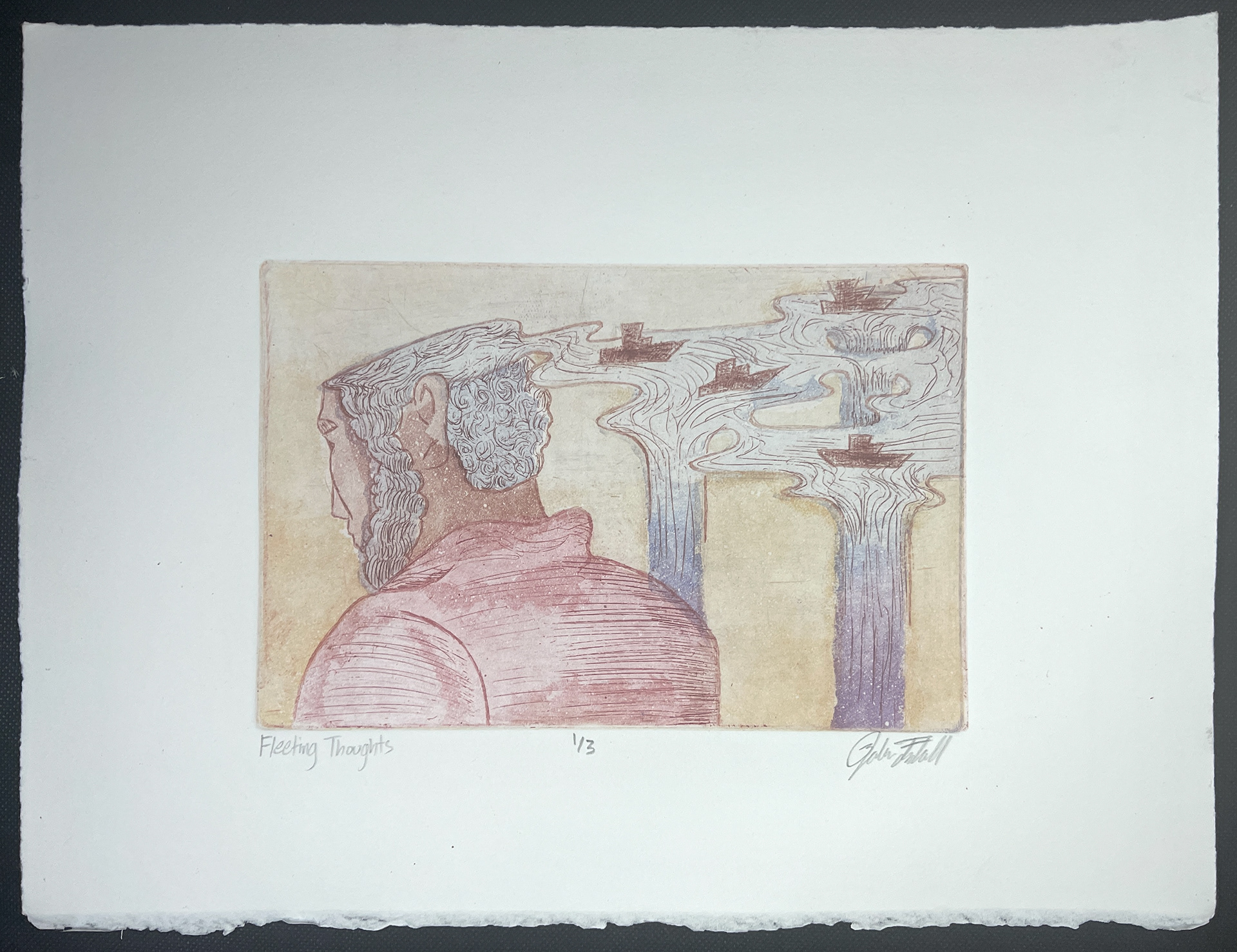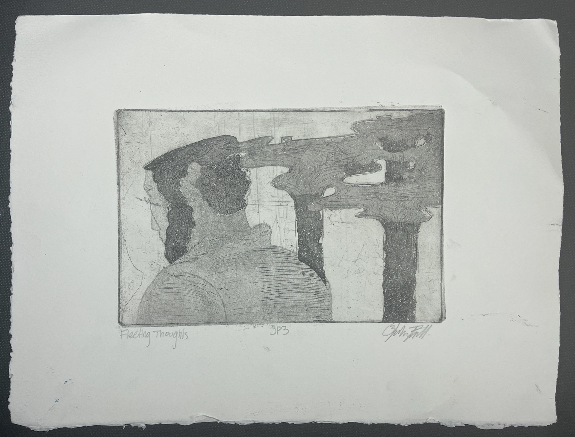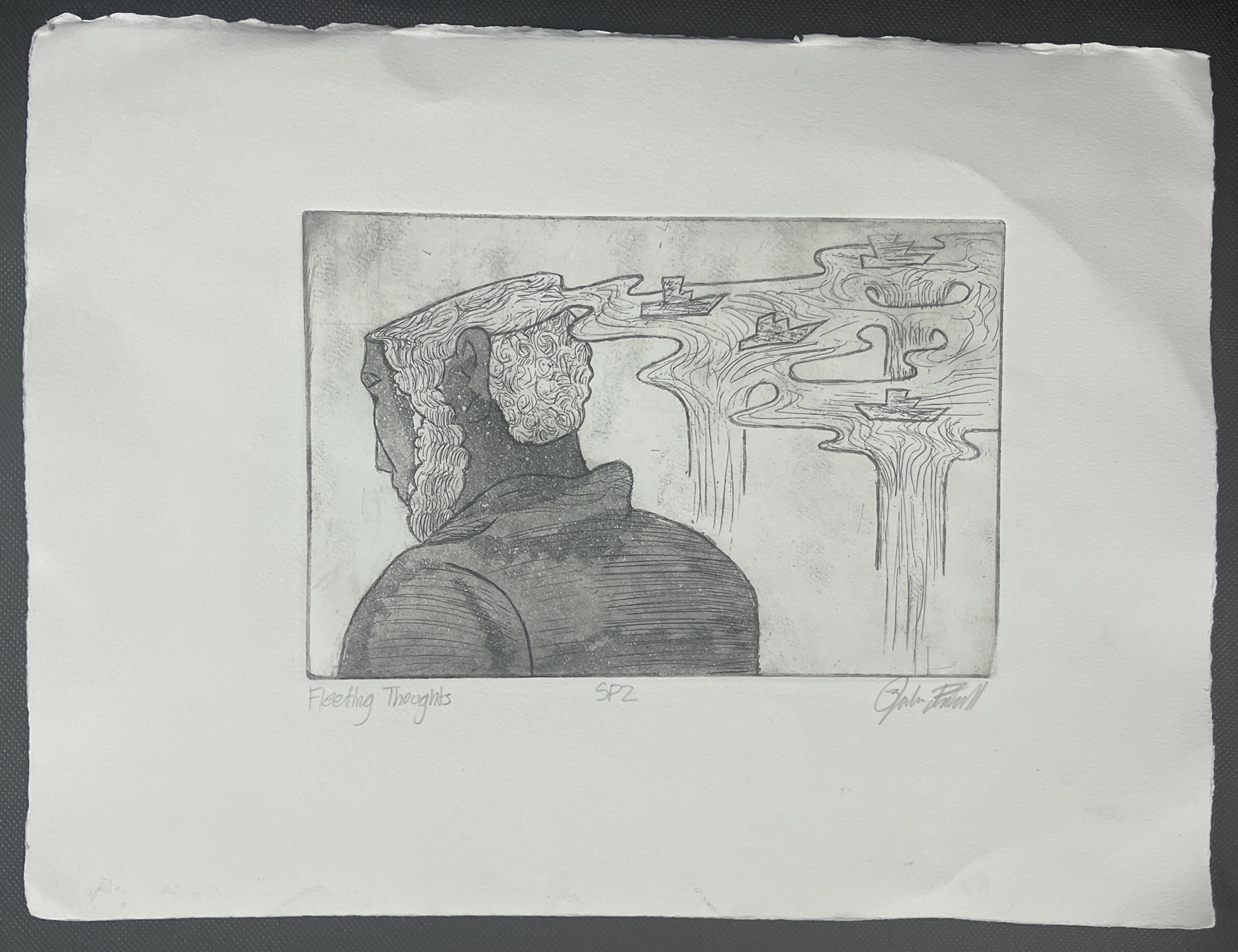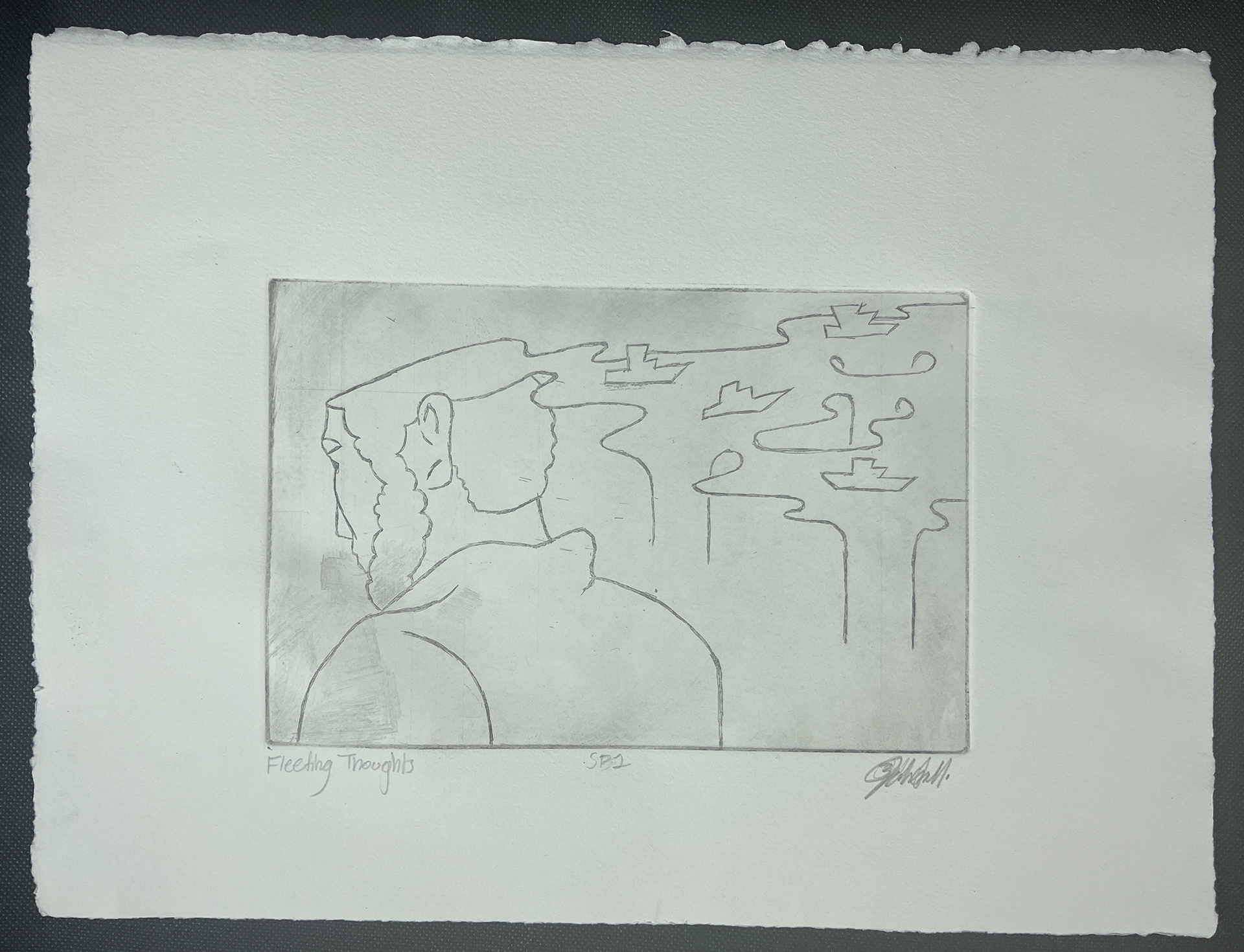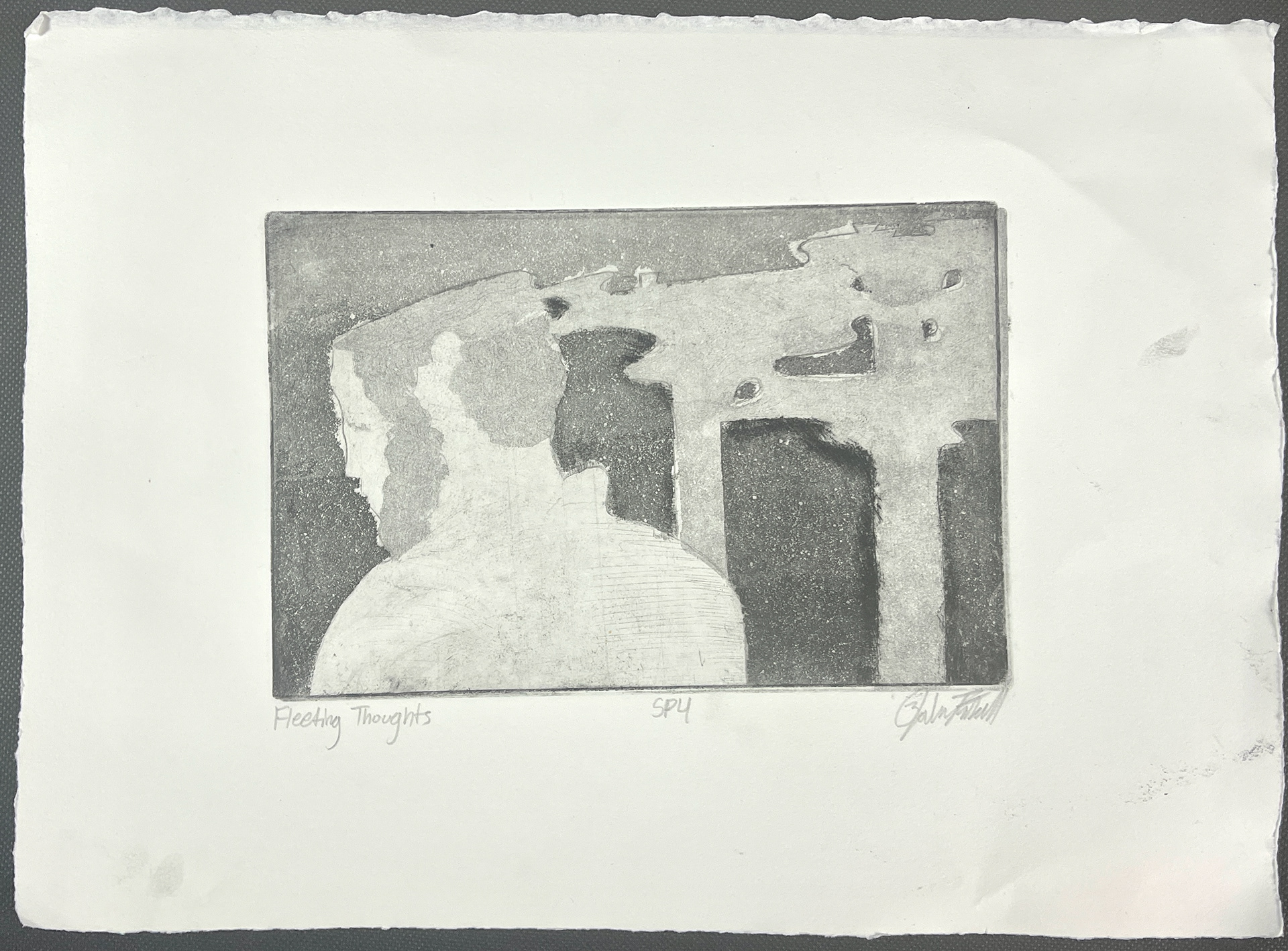 Fleeting Thoughts, Print size: 11in X 15in, Plate size: 6in x 9in. Aquatint, Etching, Intaglio. April 2022