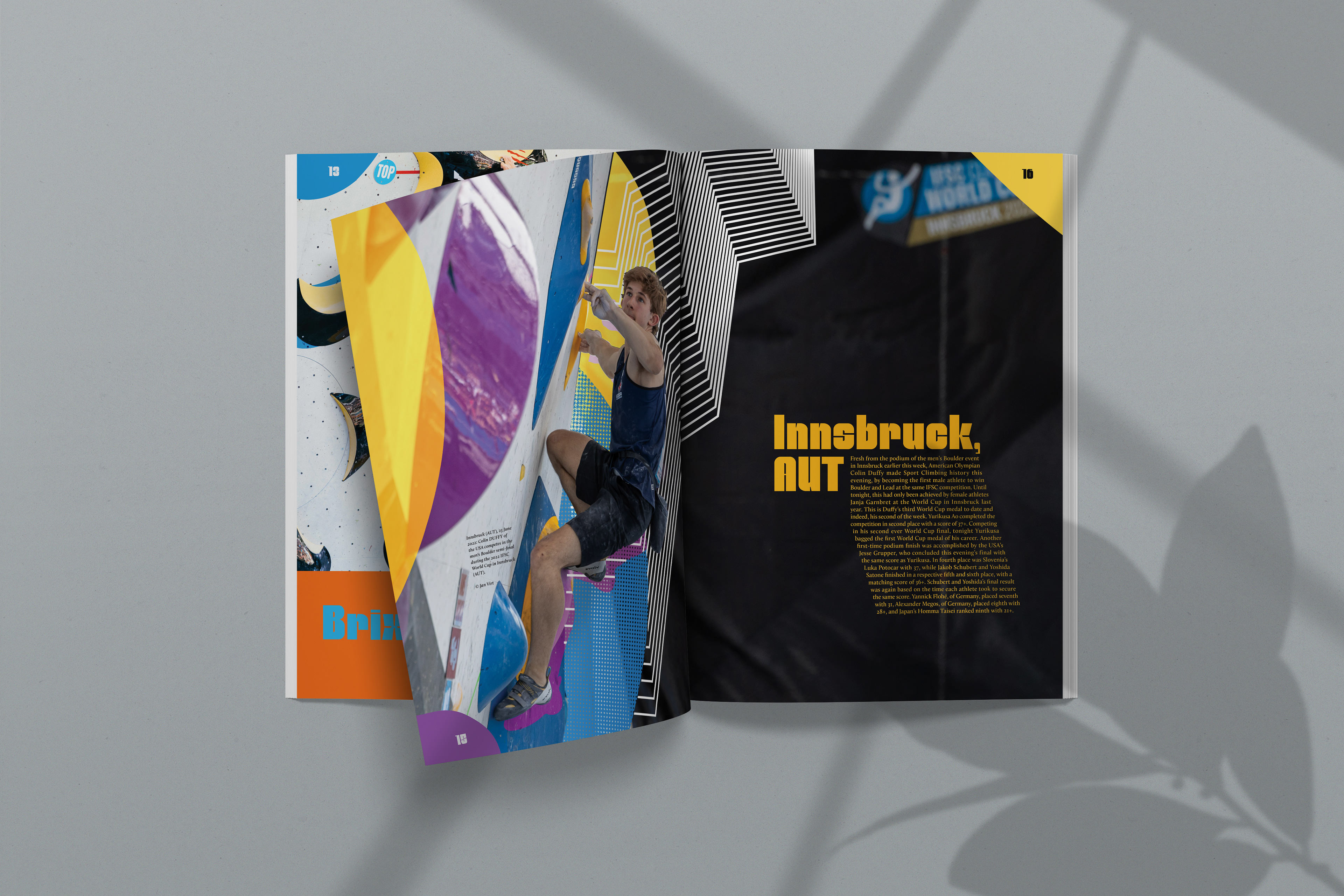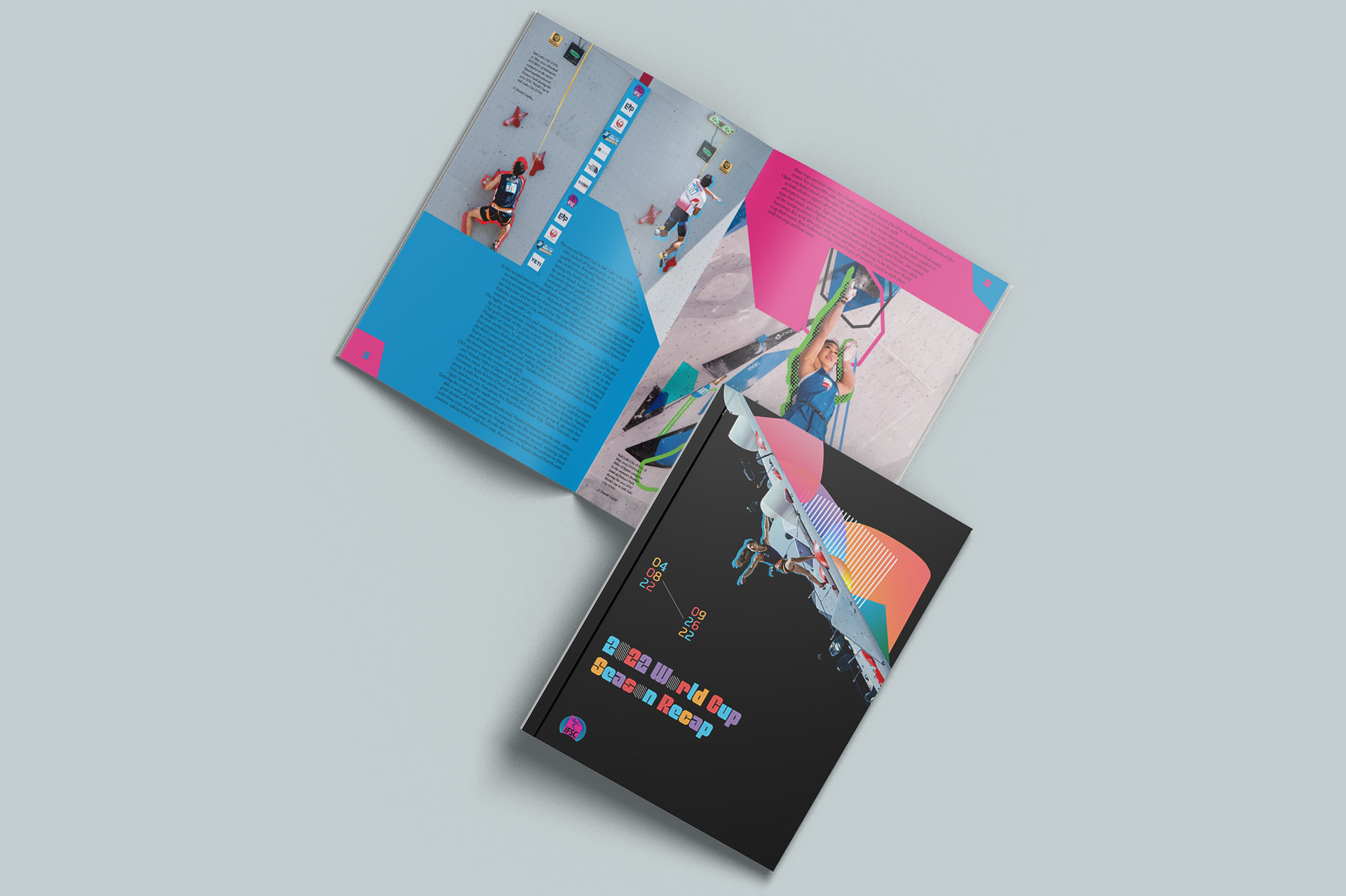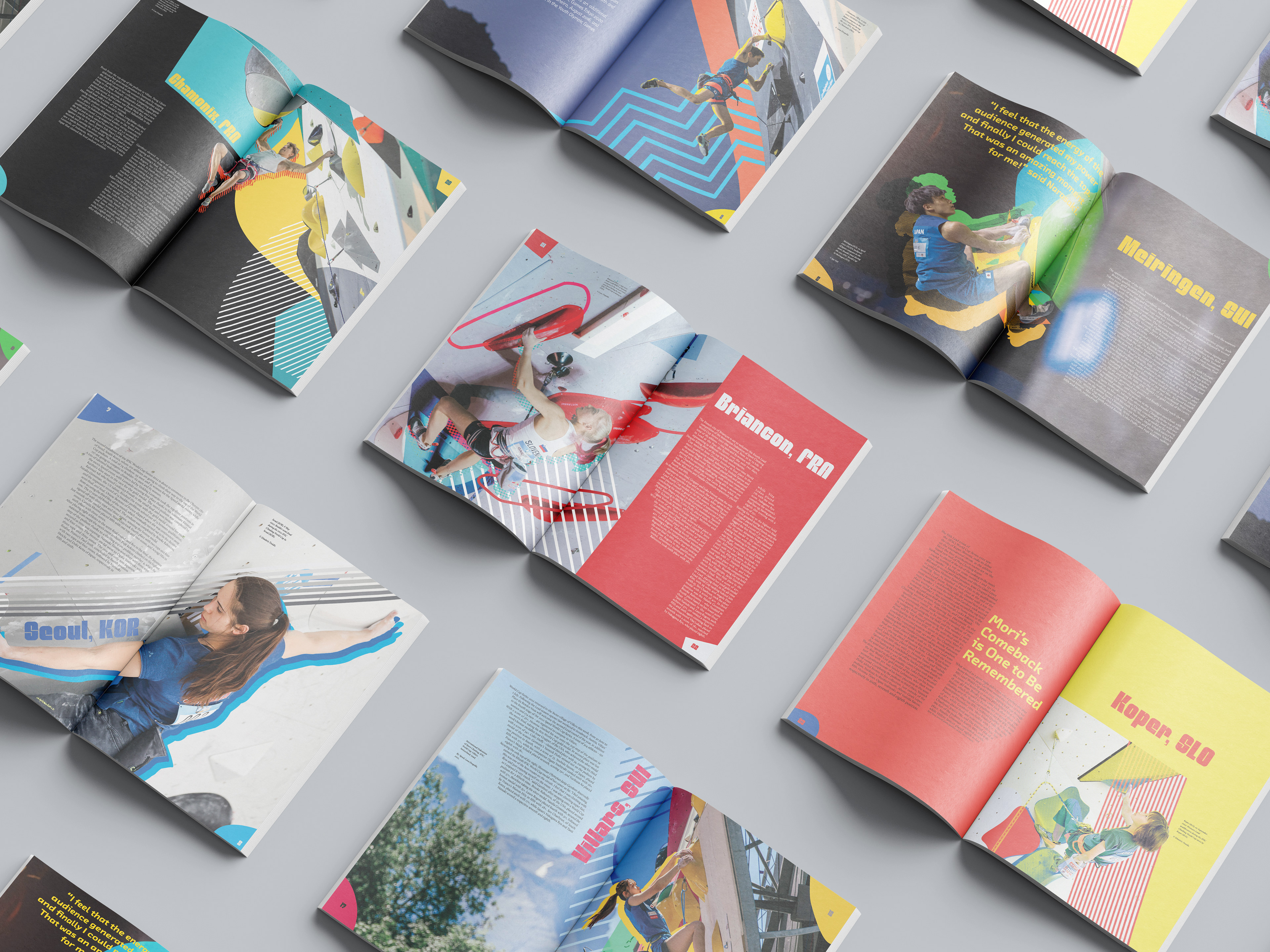 COURSE: Publication Design, Fall, 2022 CREDITS: Photo Credit: Marco Vettoretti, Lena Drapella, Dimitris Tosidis, Daniel Gajda, Jan Virt Mockups: Anthony Boyd Graphics, Mockup River, Freepik. AWARDS: Graphis New Talents 2023 DESCRIPTION: The International Federation of Sport Climbing facilitates all the events for all rock-climbing disciplines including boulder, lead, and speed. The scope of this project was to create a recap magazine for the 2022 World Cup series. The publication includes a cover and 15 spreads showing descriptions of each event and photos from each event location. Every spread in this book has a different color palette to give each page its own space and highlights the unique look of each location.