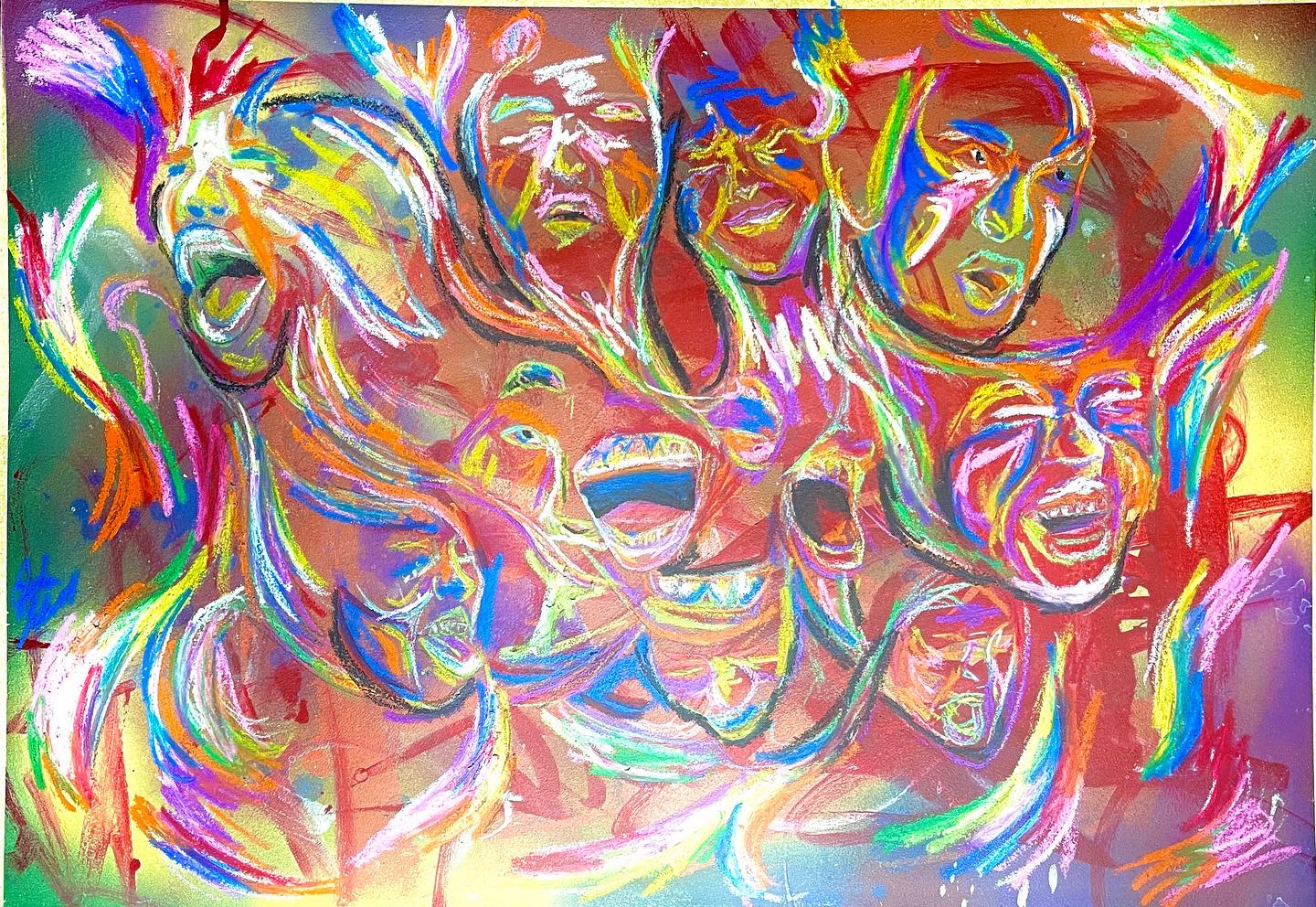 Moodswings. Acrylic paints, spray paint, and oil pastels. 15 inches x 22 inches