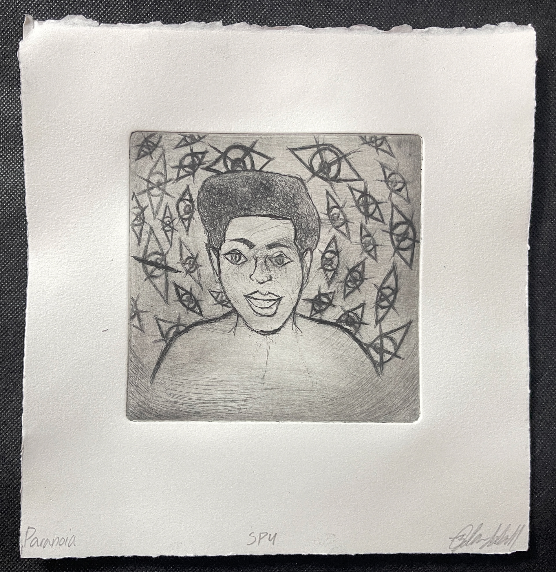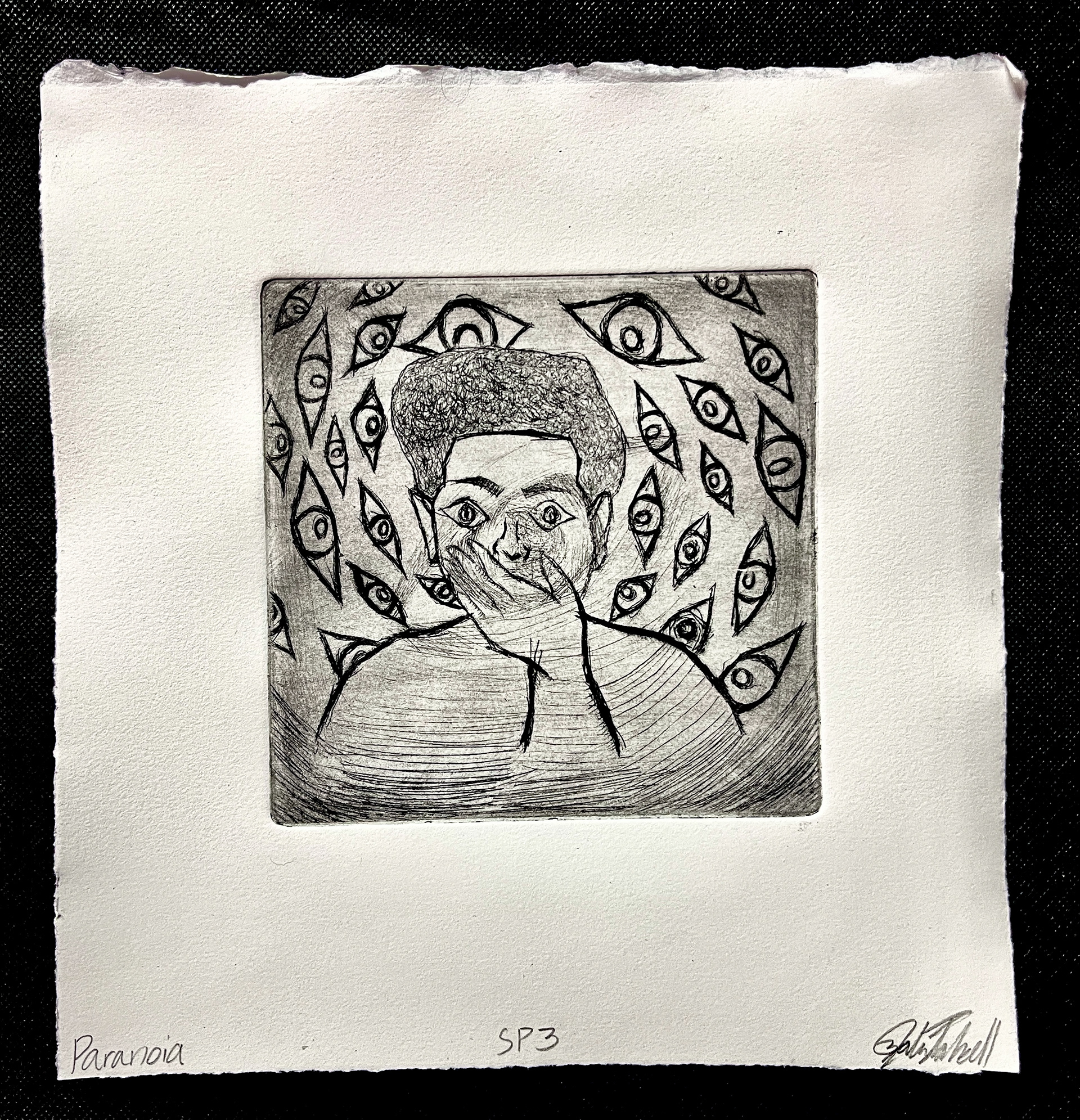 Paranoia, Paper size: 10.5in X 10in, Plate size: 6in x 6in, Drypoint, Intaglio. February 2022