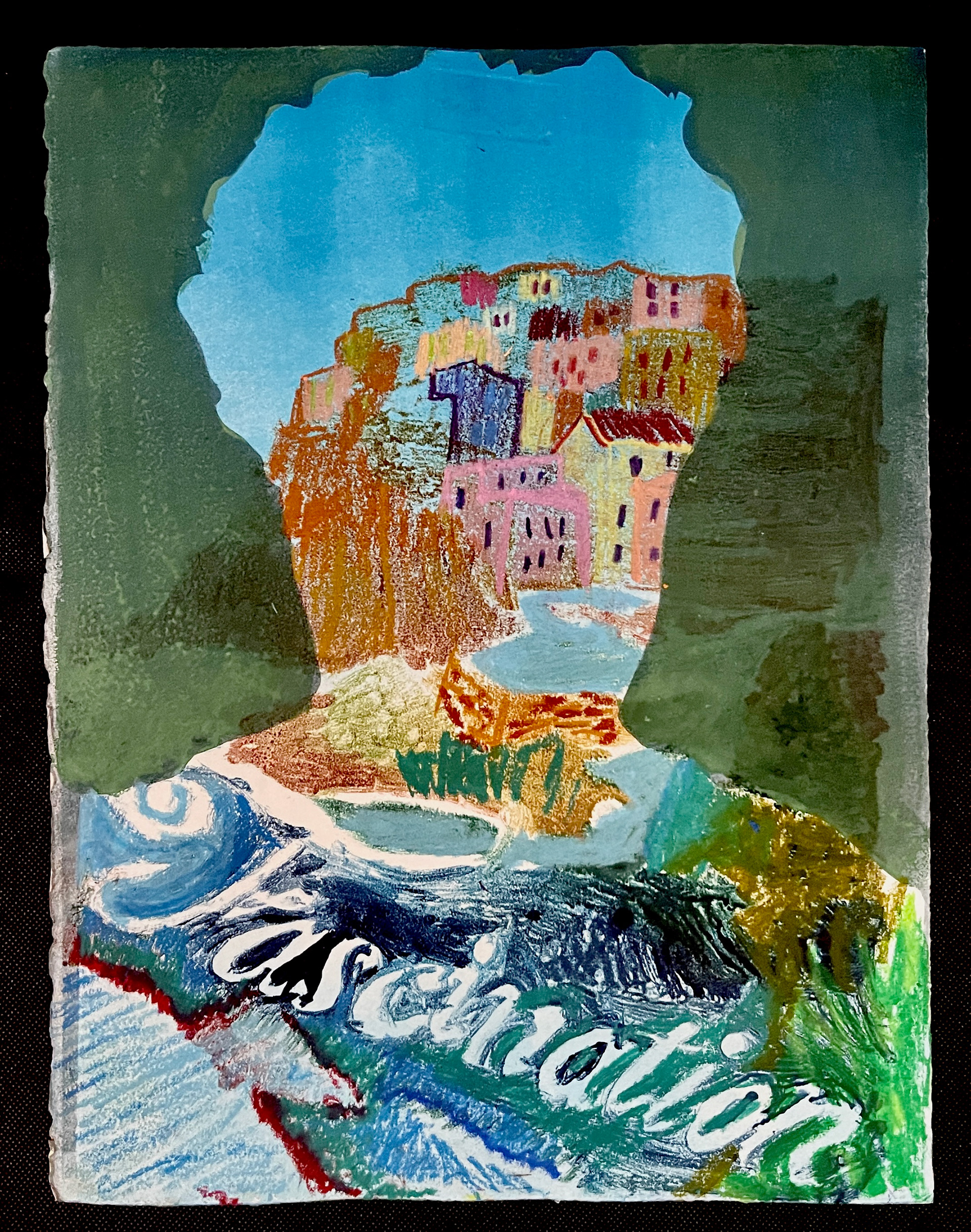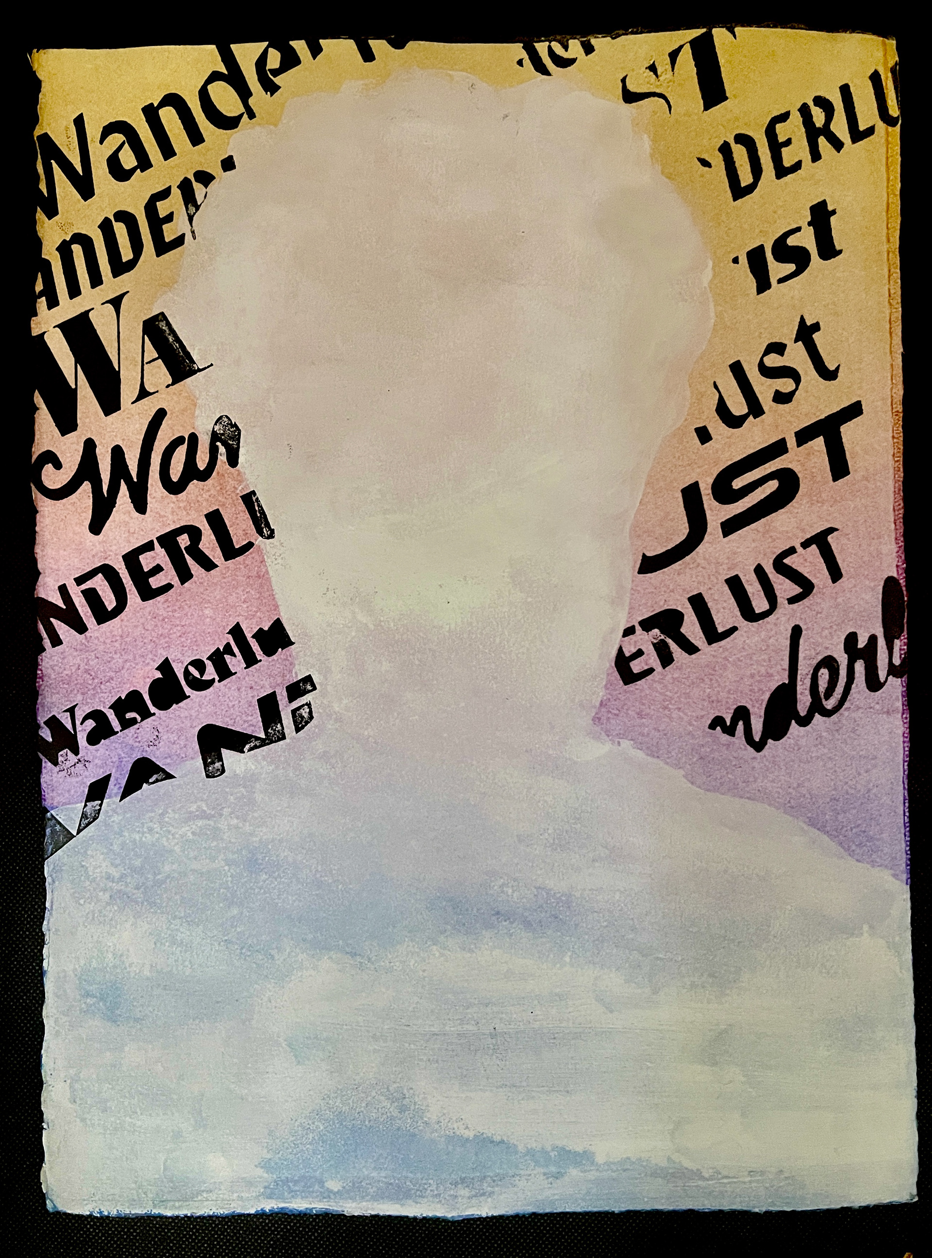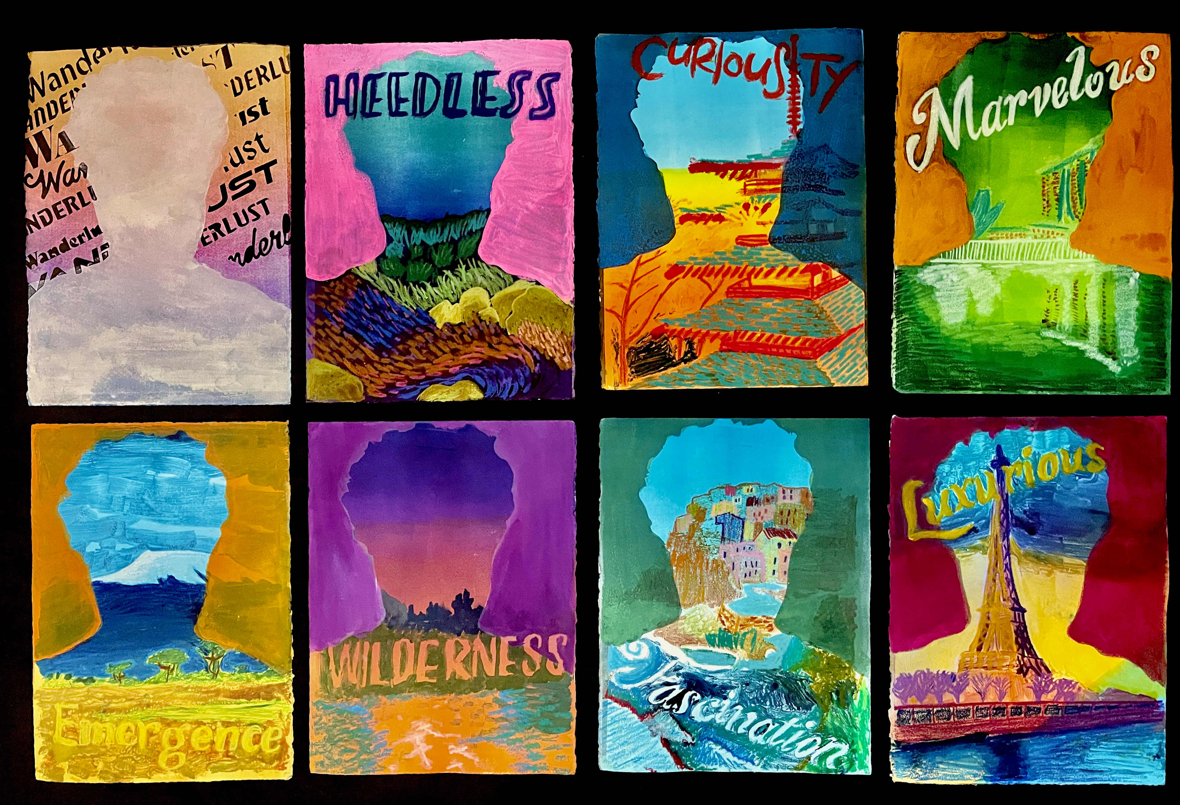 Wanderlust is a series of monotypes exploring the dream location I would go to in an ideal world. As a figment of my dreams, that is why they are placed inside my silhouette. They are all modeled after destination postcards and include the text of what I imagine when I think about each place.