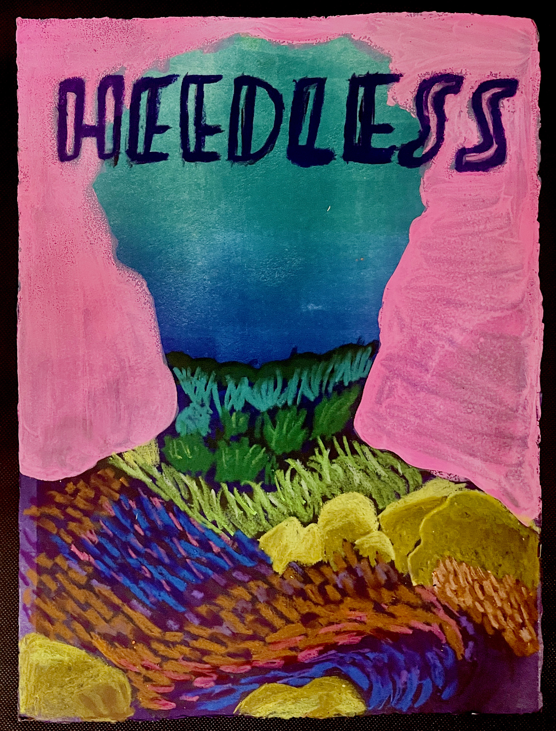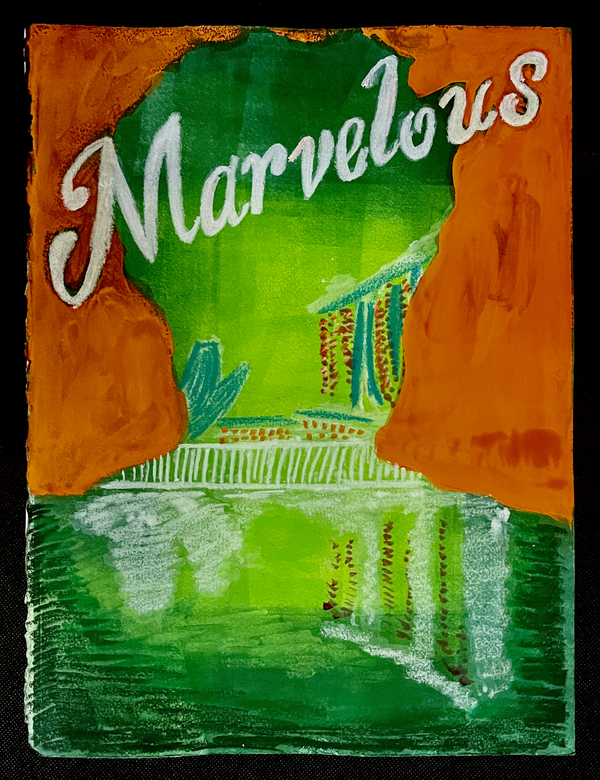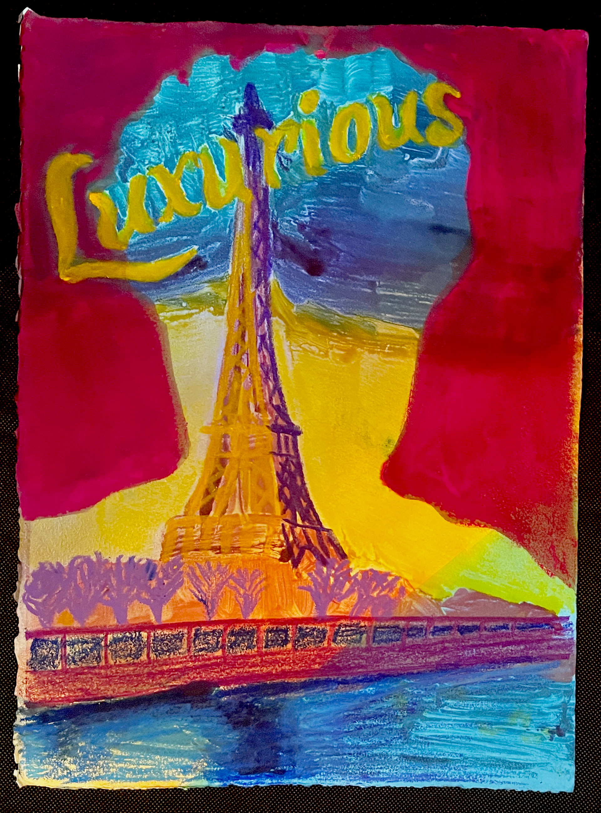 Wanderlust is a series of monotypes exploring the dream location I would go to in an ideal world. As a figment of my dreams, that is why they are placed inside my silhouette. They are all modeled after destination postcards and include the text of what I imagine when I think about each place.